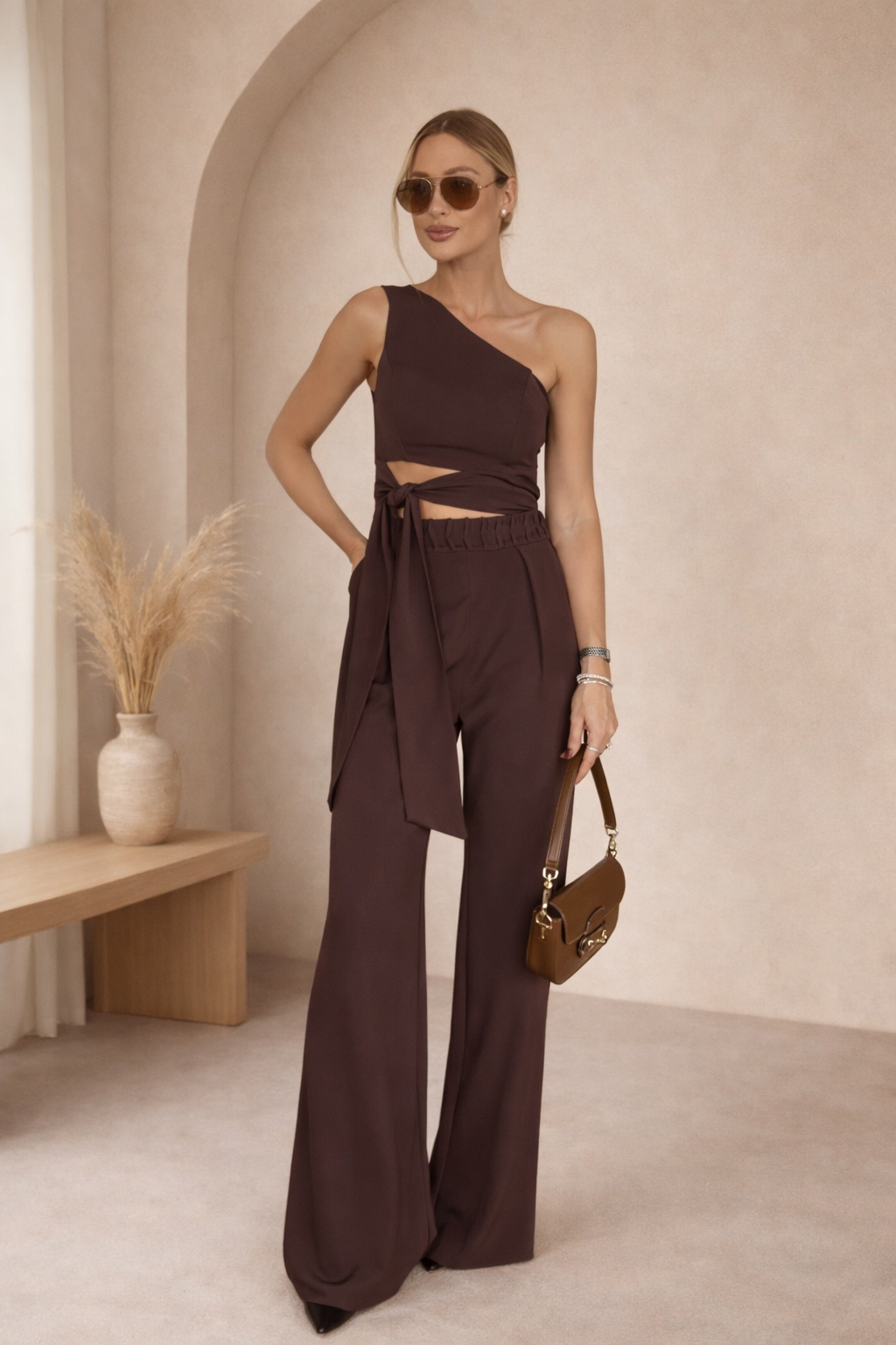 O macacão possui um corte one shoulder (de um ombro só), que valoriza o colo de forma elegante. A amarração frontal na cintura proporciona um ajuste perfeito, destacando a silhueta, enquanto a calça de caimento reto traz um toque sofisticado e alonga a figura. Produzido em tecido de alta qualidade, com toque macio e excelente caimento, garantindo conforto e sofisticação em qualquer momento do dia. Disponível exclusivamente na DOT Clothing, tanto no site oficial quanto no aplicativo da marca. Você pode adquirir online e receber no conforto da sua casa.